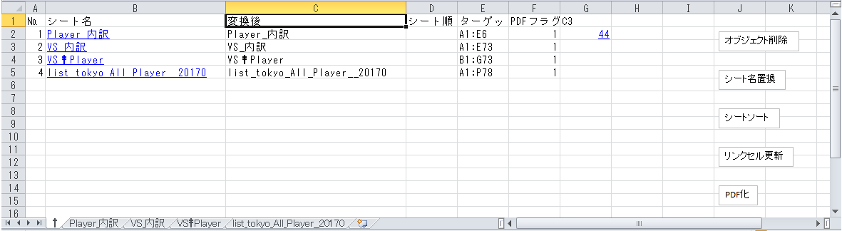 「シート名置換」を押すと、B列のシートをC列の名前に置換する。