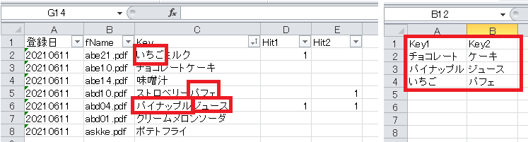 右側のセルにキーワードをいくつ含むかカウントする処理を入れた。