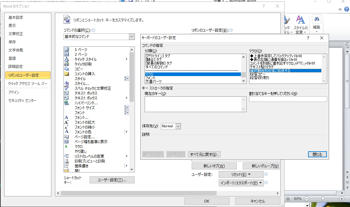 分類(C):からマクロを選択して、ショートカットキーを登録するマクロを選択。