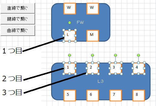 引く線は、直線コネクタと鍵コネクタと曲線コネクタの3種類を用意。