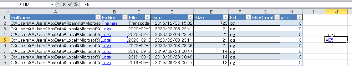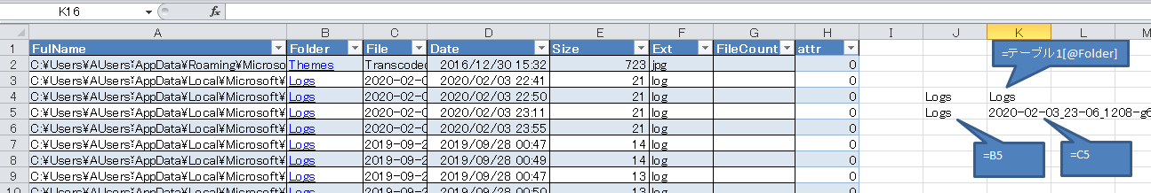 「=テーブル1[@Folder]」・・・@があると同じ行のセル、@がないと全行の意味