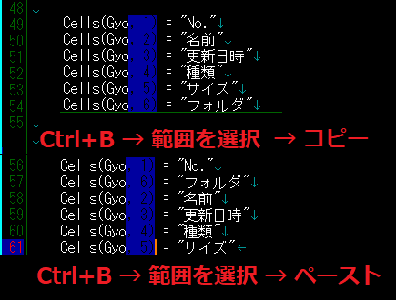 結論としては、最初に書いたベタ打ちでOKという話。テキストエディタの矩形選択機能を使うと、